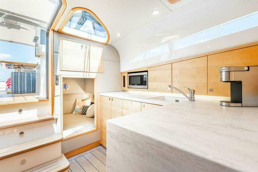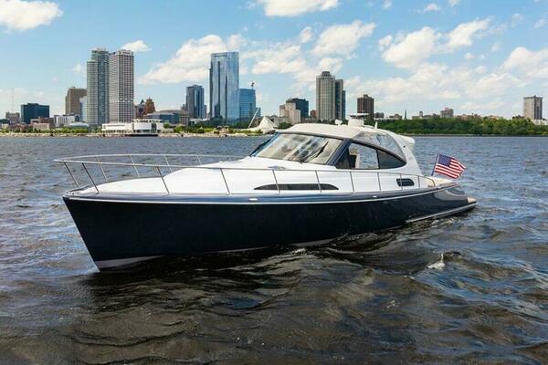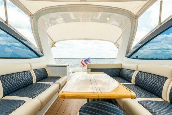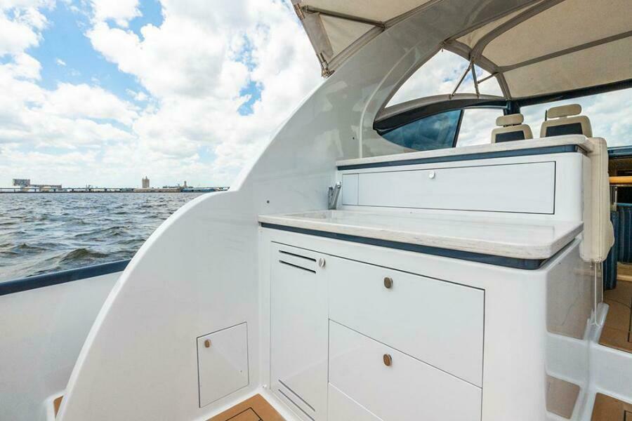 She is one of only 2 in the world built with the open cockpit. Her upgrades include Starlink, underwater lights, custom bimini top with removable side curtains, sun awning, cockpit sunshade, and full bow rail...to mention a few. She offers 2 berths, 1 head with a separate shower, and well-appointed galley along with abundant lockers and drawers that enhance onboard comfort. On deck, enjoy two distinct seating areas—a raised helm deck with secure, sheltered bench seats, and an open cockpit lounge with plush seating and a built-in bar, perfect for entertaining. The low-profile, minimalist styling, and mirror-finish E-glass hull make this yacht as visually striking as it is functional.