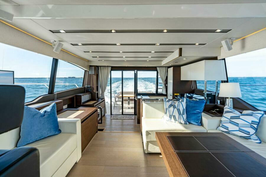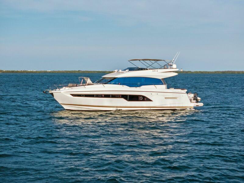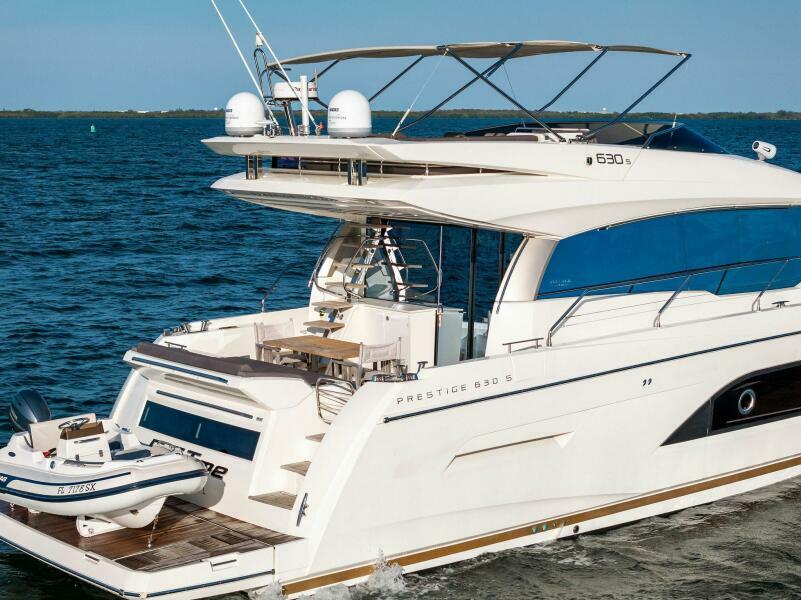 2019 63 Prestige Flybridge - "RT Time" is the only Prestige 630S currently listed for sale in the US. This model offers the best of both worlds with a spacious flybridge and a hydraulic removable bimini top and she transforms into a sleek-looking sport yacht with a large sunroof over the interior helm station.
