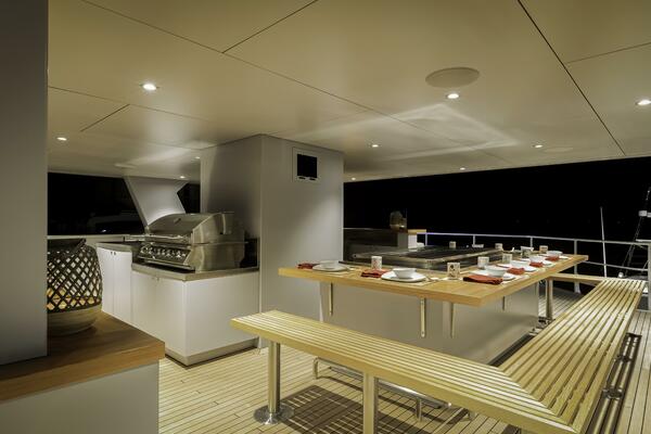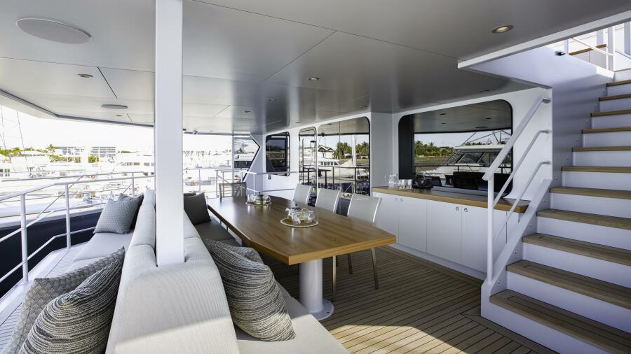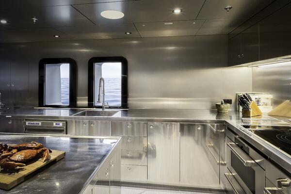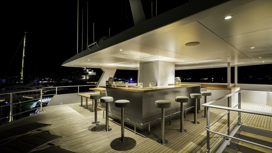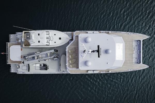 - Large Tender Storage: Optimized configuration with 13m tender storage port side, 8m and 5m tenders starboard side (three tenders total)