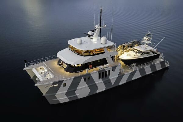 "At first glance, the grey camouflage paintwork of this vessel suggests a small warship, perhaps a patrol boat, but this disguise — handy in the remote areas that a long-range explorer such as this might visit — was just one element of the owner's detailed specification. The judges were also impressed with the launching system for the sport fishing boat, with a safe two-point lift provided by a pair of large knuckle-cranes. The way the vessel met the long list of detailed fishing and leisure requirements set out by its owner made this a very attractive yacht."