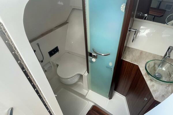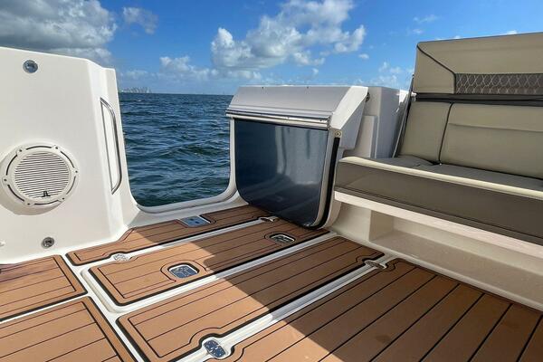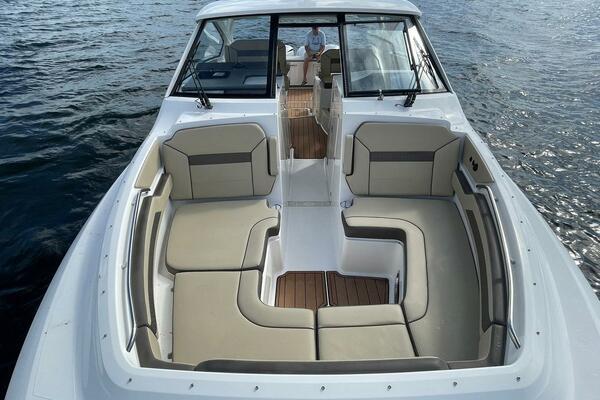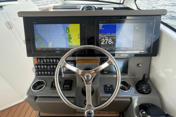 Highlights include a large tempered glass windshield, spacious walkways, and ample storage. The helm offers smooth operation with an optional Garmin electronics suite. Below deck, a cabin with solid wood accents includes a full berth, an aft berth, and plenty of natural light, ideal for weekend stays.