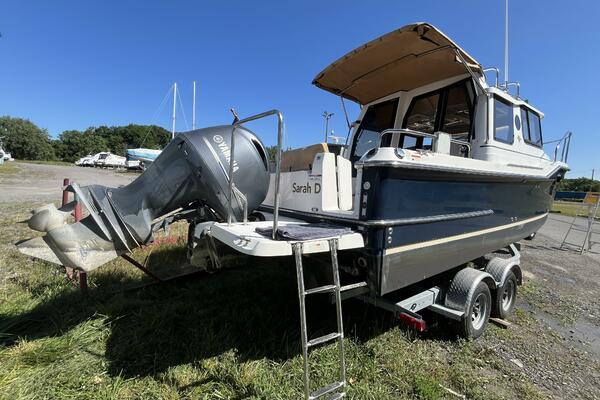 Clean, Fresh Water, One Owner Beauty! Heavily optioned with 200hp Yamaha, 286 hrs, 6hp Mercury Kicker, 5 hrs, Bow Thruster, Garmin MFD, Garmin HDX Radar, Auto Pilot, Standard Horizon Explorer VHF, Spotlight, Inverter, 90W Solar Panel, Diesel Cabin Heater, Macerator w/Y-Valve, Windlass w/both Bow & Helm Controls, 4 New Deep Cycle batteries, Black Hydrocoat over Epoxy Primer, Canvas package, Skyscreen Package, Tidewater Tandem Axle Trailer included! Winter storage has always indoors.