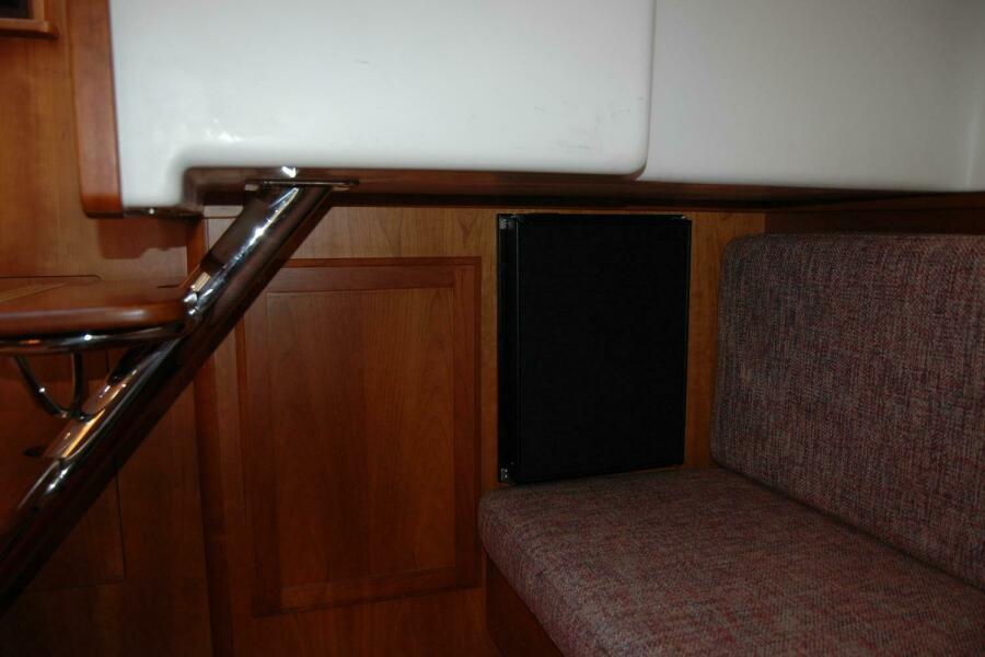 Aft of the galley is the lower lounge area which can be made up into a double berth with privacy curtain if needed. Many owners report that this is a favorite spot to enjoy a good book in the evening. Optional hull port with shade offer visibility outside. Under the steps is the optional freezer and additional large storage area.