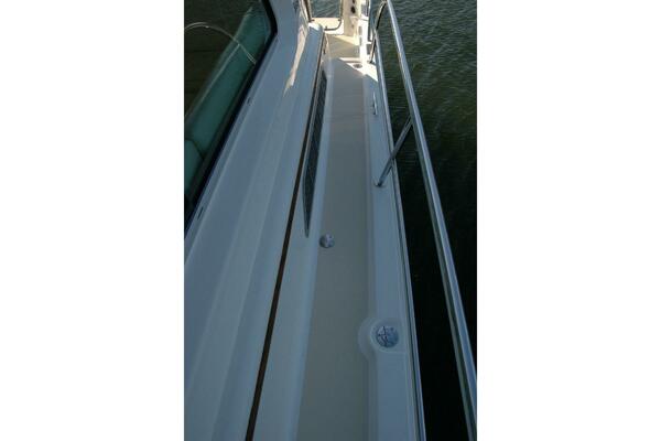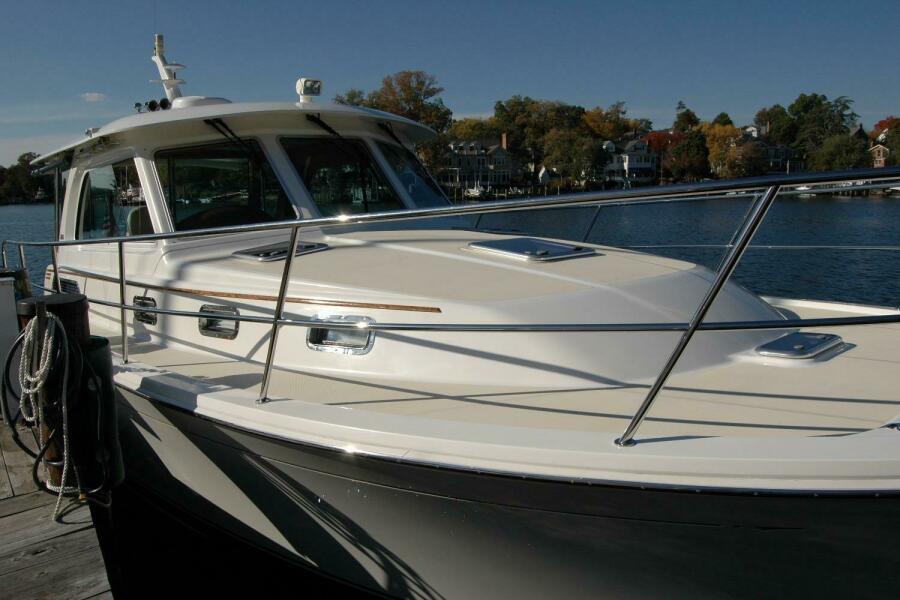 Wide side decks afford easy passage with good handholds found throughout. Anchor forward is deployed and retrieved by a windlass, and the rode is stored below on centerline. Additional storage lockers are found on either side and are great for storing fenders, lines, and a wash down hose.