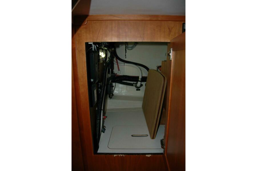 Cockpit has both forward and rear facing seats, with the forward facing seats on an electric sliding mechanism to enhance cockpit space as needed, and the teak cockpit table slides with the seat. Storage can be found below all seats. Engine/machinery space is accessed by a large hatch in the cockpit sole.