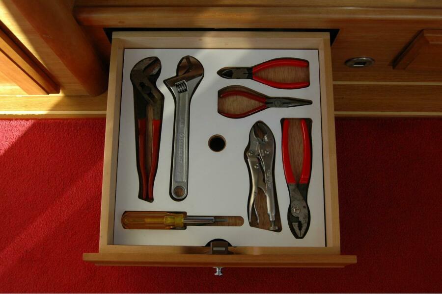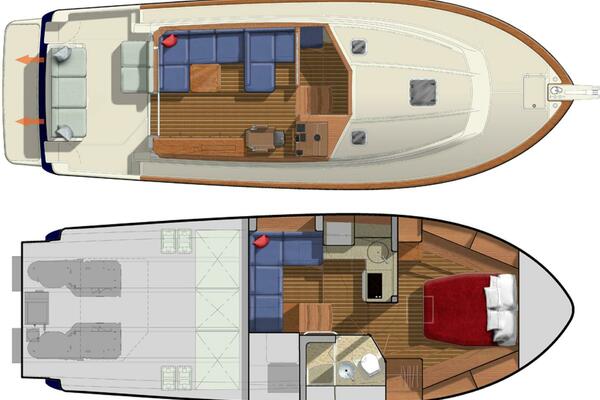- Upper storage to port and starboard with two enclosed lockers aft and fiddled shelves forward.