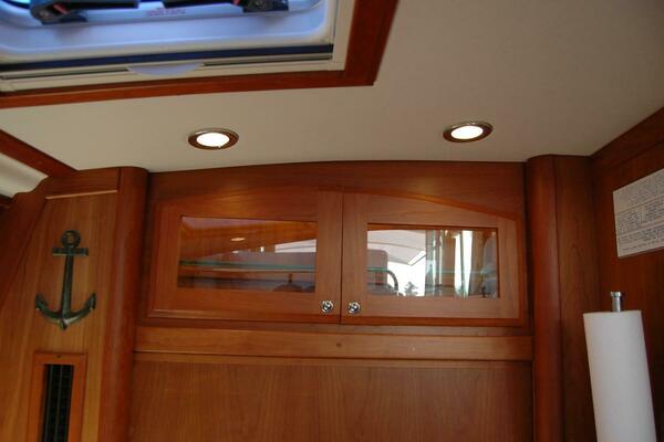 Starting below in the master stateroom, you will find a comfortable island berth with custom Portland Mattress Makers 10" mattress, storage below the berth and flanking either side of the stateroom as well. Hanging locker is to starboard with a nice blend of cabinet and drawer storage opposite to port. A motorized partition panel has a TV on the side facing the master berth, and it also doubles for additional privacy when needed.