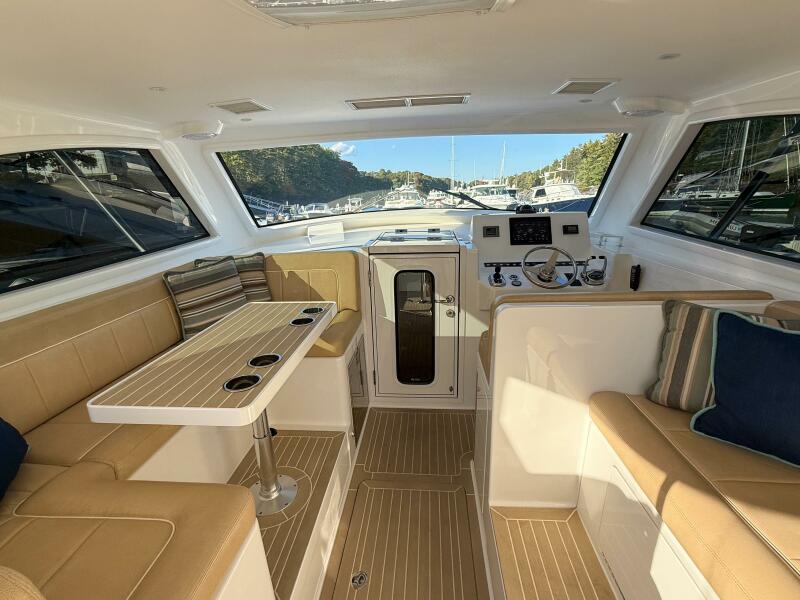 - Port side U-shaped lounge seating with Ultraleather cushions and fiberglass Hi-Lo table