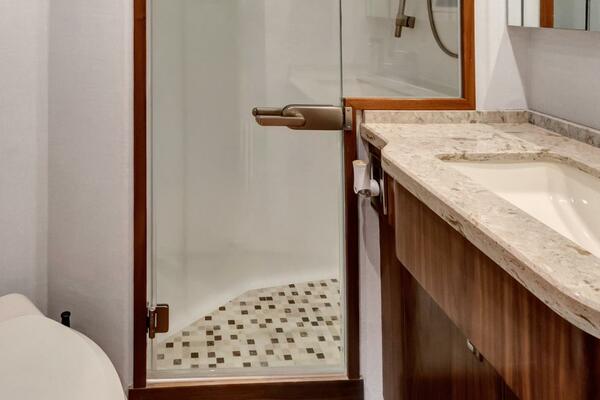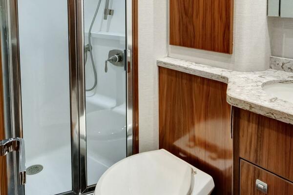 - Custom Forward VIP arrangement with centerline queen and two single berths outboard