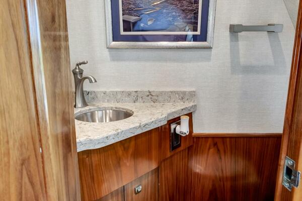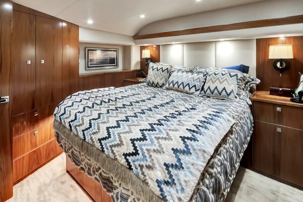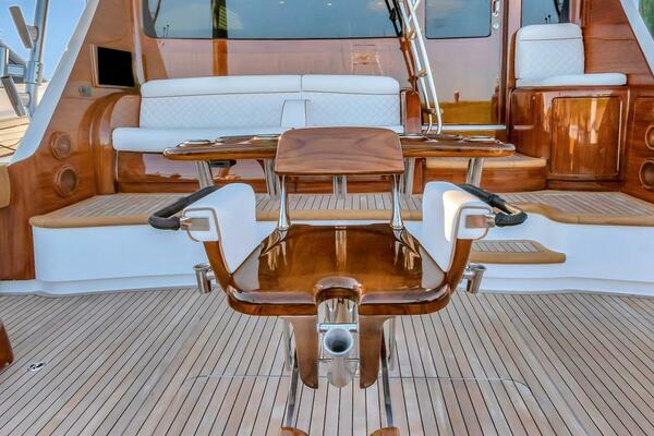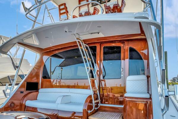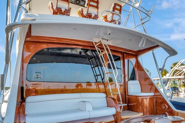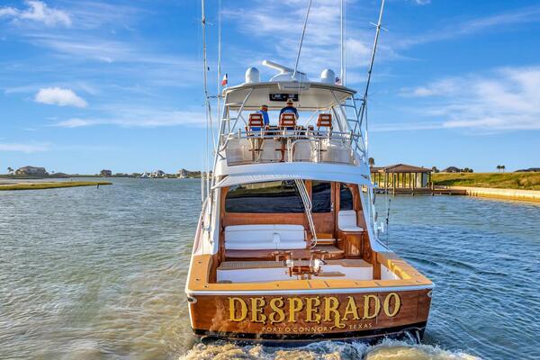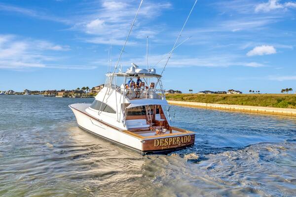 Desperado is a 4 stateroom 5 head layout with dedicated crew stateroom and Crew head. Her interior is finished in satin walnut with a beautiful complement of designer fabrics. She features a large Master stateroom to starboard, a centerline queen forward with two overhead bunks to either side of the bed that will accommodate extra guests. The port stateroom is over and under bunk set up with its own head. She features a spacious salon with day head, L-shaped storage sofa, and loads of custom wood work. The dinette has a second TV overhead and a drawer underneath large enough for additional rod storage. The galley features Sub-zero drawer refrigeration, a convenient raised counter with bar stool seating and beautiful tile backsplash. Behind the galley is a pantry that doubles as a rod storage area. The cockpit floor is fully clad with Teak as are her coamings and covering boards. "Cool breeze" cockpit A/C keeps anglers comfortable while they reel in that big Marlin in the stunning Release marine fighting chair. Redundant systems are built in throughout the boat including 2 water makers, 2 ice makers, and 2 generators as well as extra fuel and a custom fuel transfer system if one wanted to use bladder tanks for longer trips. The transom cockpit bulkhead and toe rails are done in a custom faux teak paint job and she has a custom anchor chute system with windlass to keep the decks clean. On the flybridge you'll find a comprehensive set up of electronics as well as the