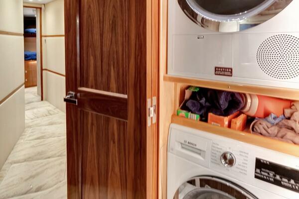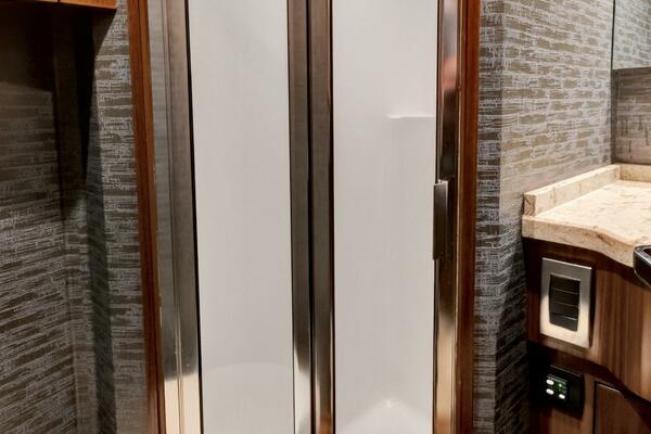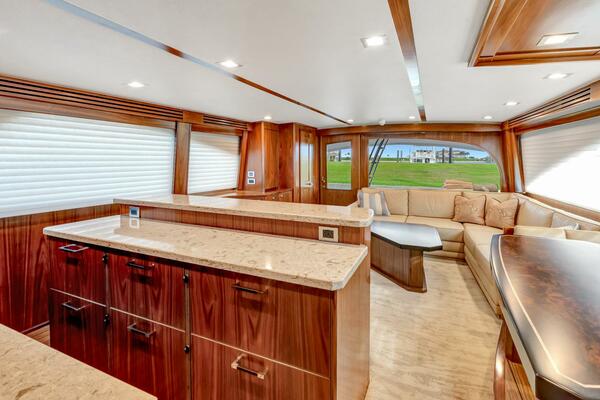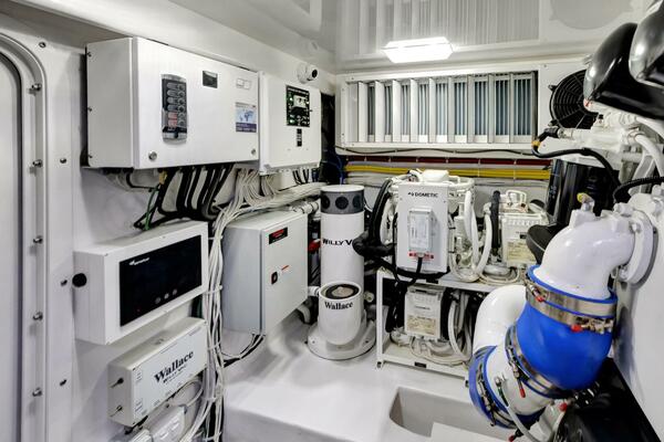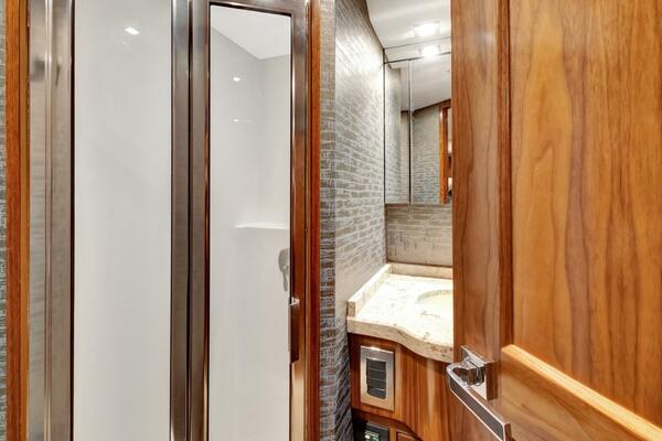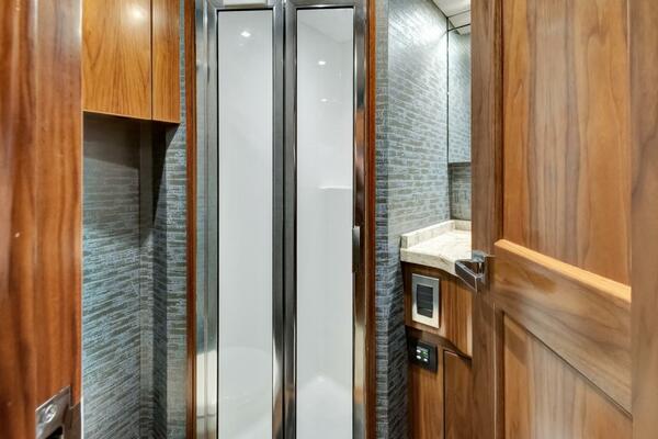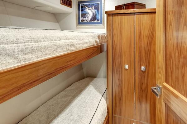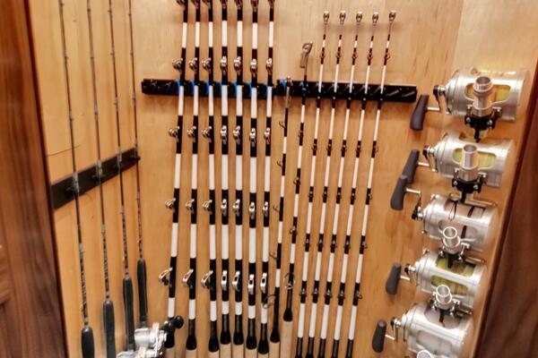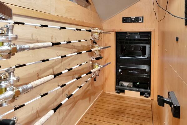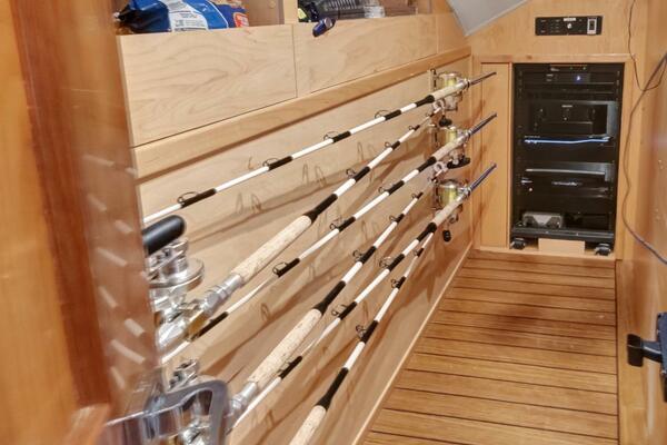 - Large walk-in pantry forward of galley with custom cabinet doors forward and custom rod storage system for multiple size tackle