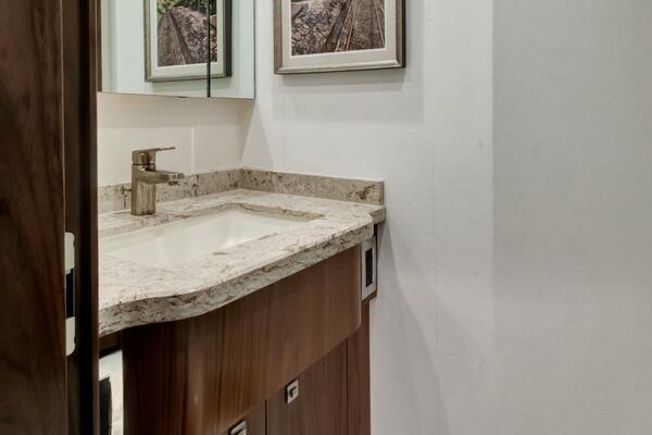- Salon pop-up TV with customized lower cabinetry for bottle storage on the forward edge and 3 pull-out maple drawers inside