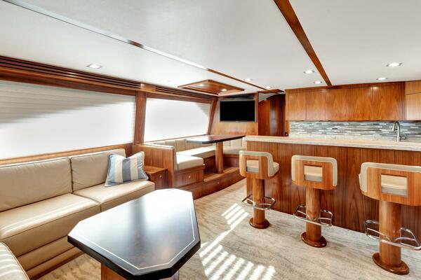 MTU joystick docking system complete with dynamic positioning and hydraulic windlass. Hydraulic outriggers and 4 huge electronic teaser reels are at the captain's fingertips behind the center console helm pod. With her MTU 12V 2000 engines she is and incredible performer cruising at a brisk 34kts with top speeds near 40kts.