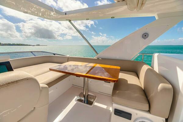 The main deck forward is home to forward-facing sofas and sunbeds that are well suited for soaking in the rays while at anchor or underway. The yacht's oversized flybridge with an opening sunroof is an ideal spot to enjoy cruising on a sunny day.