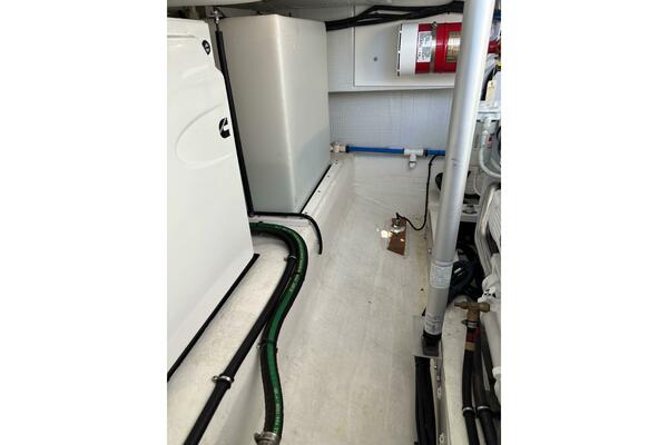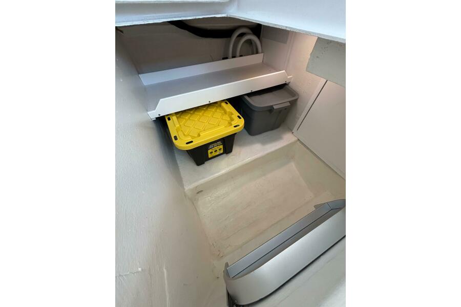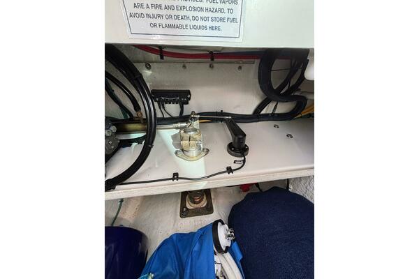 - Large bilge storage below helm sole, access by gas strut assisted hatch w/ emergency access to engine room