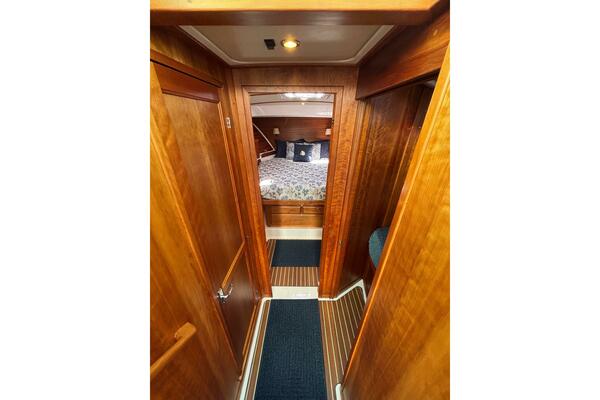 Designed for long-range cruising, the Back Cove 37 is a fuel-efficient Downeast cruiser with the space and comfort to travel far in style. Her layout includes a private master stateroom with island berth, a full guest cabin, and a spacious head with separate shower. The mid-galley is fully equipped and filled with natural light from the large overhead windows.