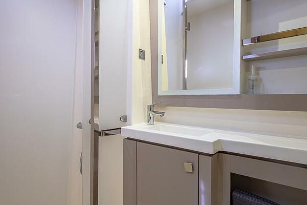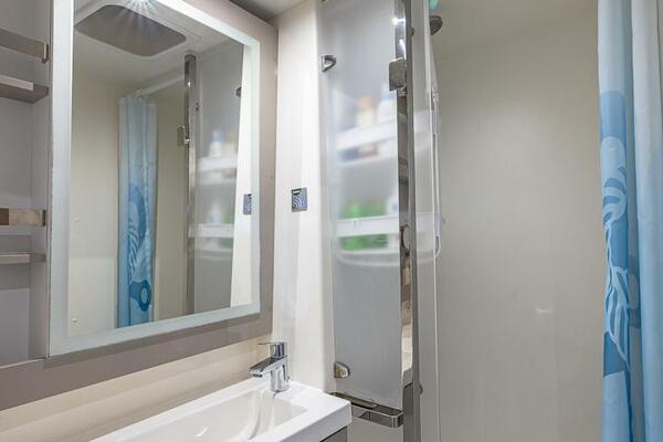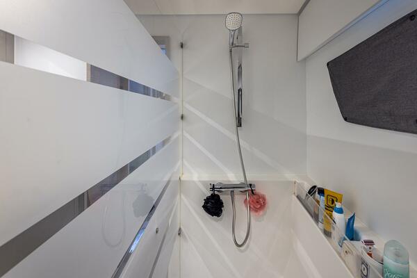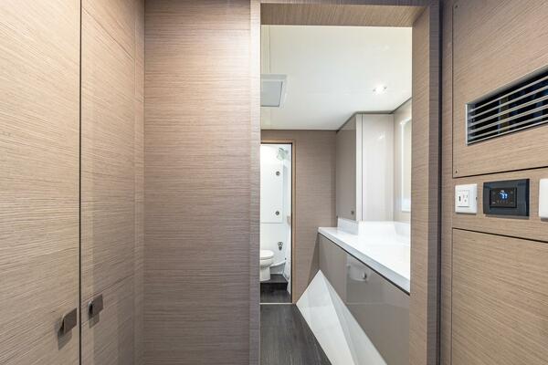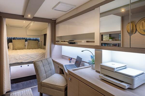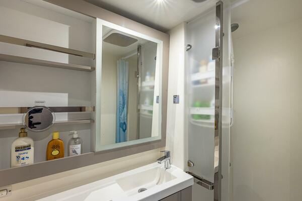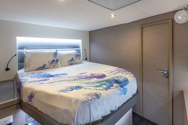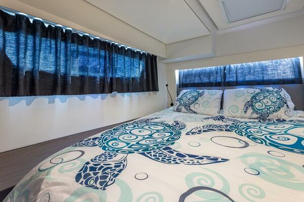 - Owner stateroom takes entire port hull with blackout curtains, custom cabinetry, walk-in shower, and upgraded Casper Memory mattress