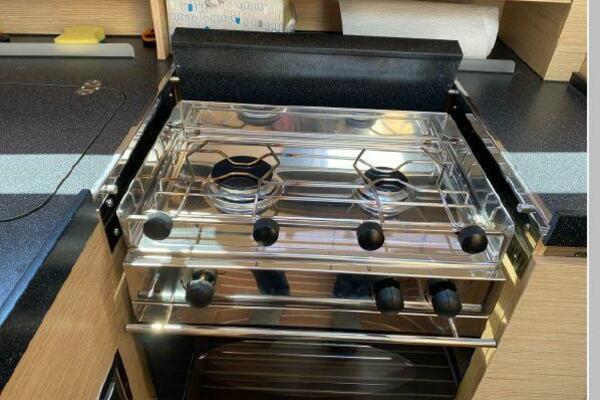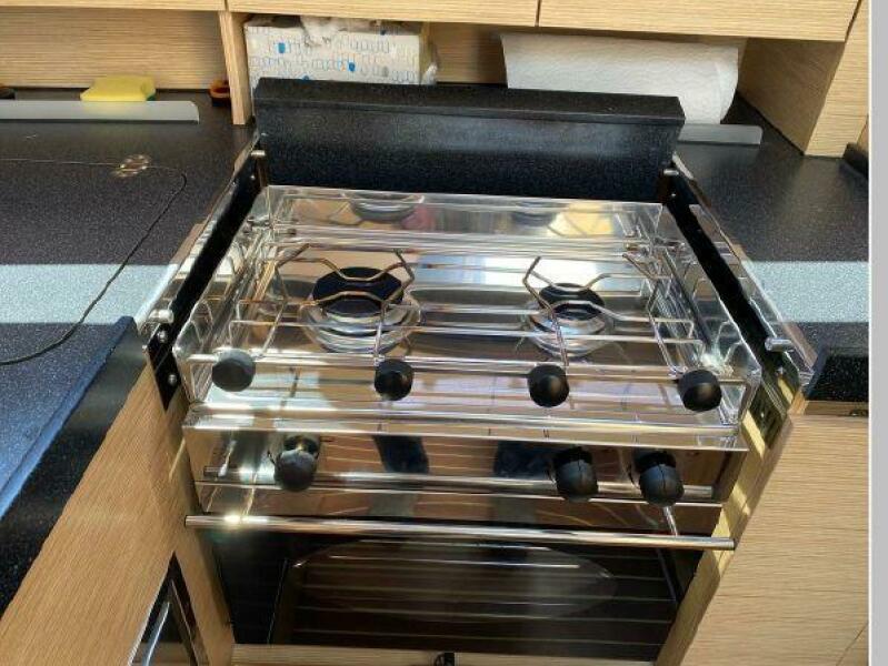 - 2-burner gas stove, 12 V fridge approx. 130 l, waste bin, stainless steel sink with mixing tab