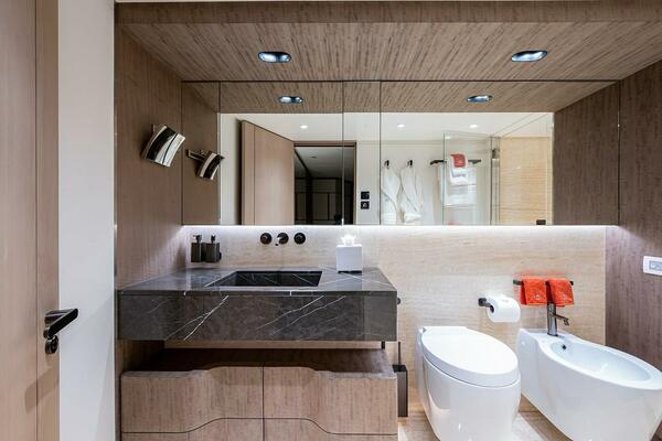 Modern bathroom in 2020 Majesty 140 yacht with sleek fixtures and minimalist design.
