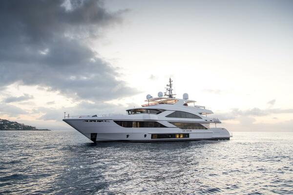 Luxury Majesty 140 yacht cruising at sunset, 2020 model.