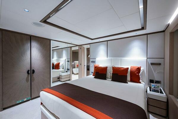 Luxurious bedroom interior on 2020 Majesty 140 yacht, featuring elegant decor and modern amenities.