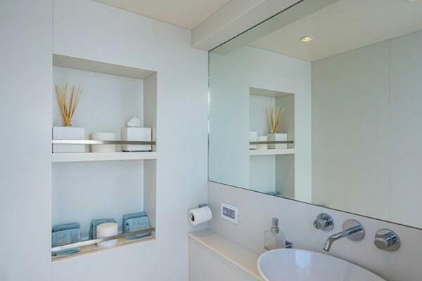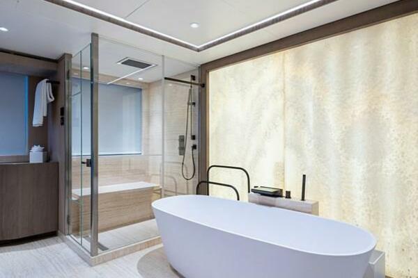 Luxurious bathroom interior on 2020 Majesty 140 yacht, featuring modern design and elegant finishes.