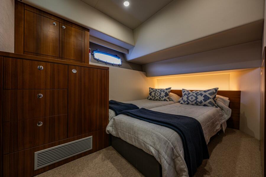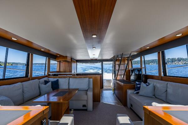The M59's interior is finished in a beautiful handcrafted satin teak with bright wall soft touch materials, large opening windows and modern sumptuous furnishings that create a bright open and warm feel. The main salon, owners suite, staterooms the skylounge were designed to optimize the space and offer excellent livability in every room.