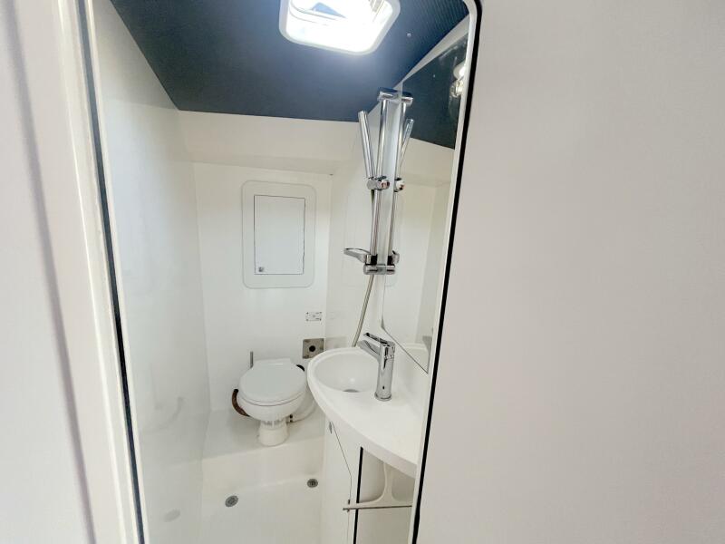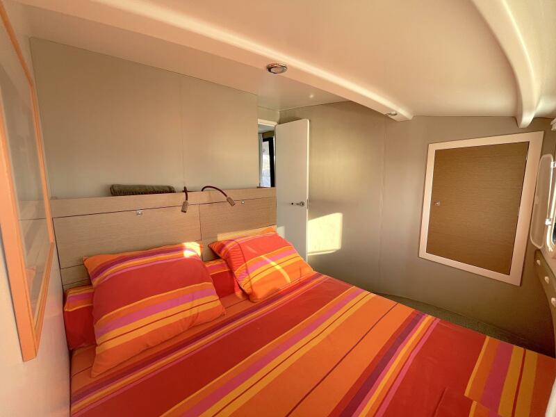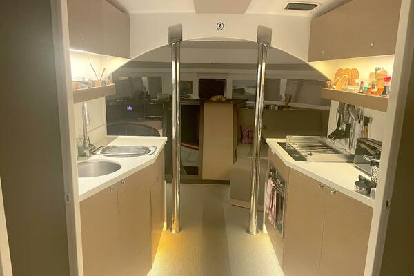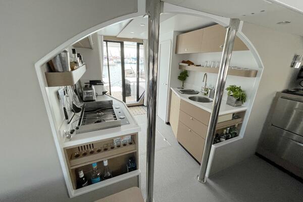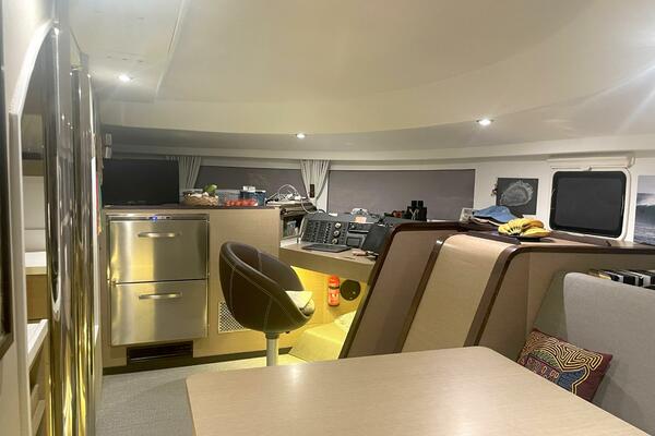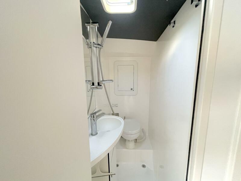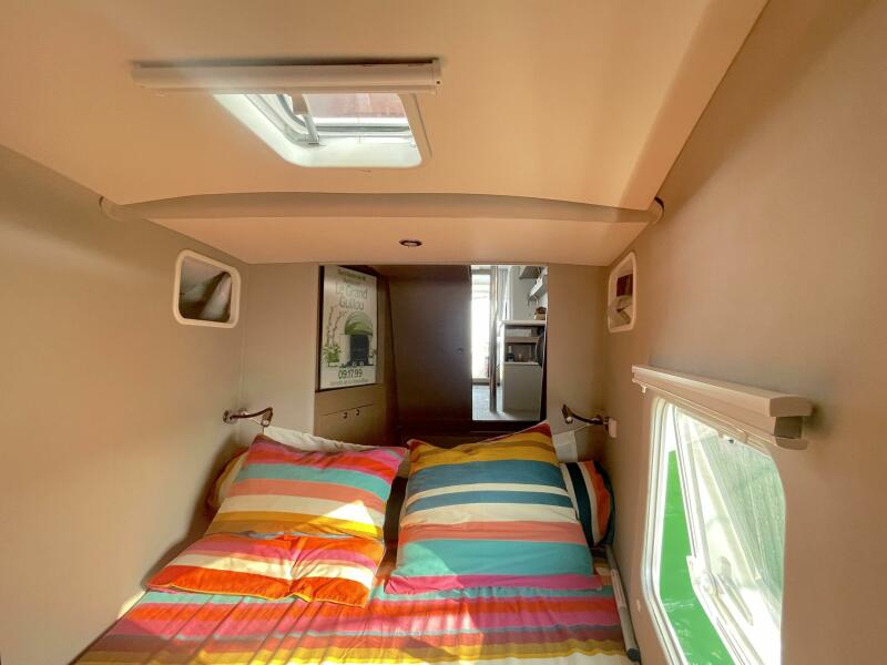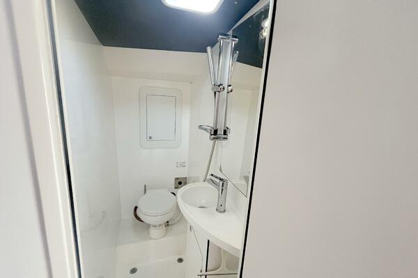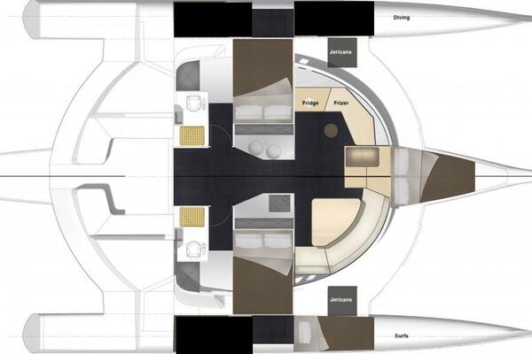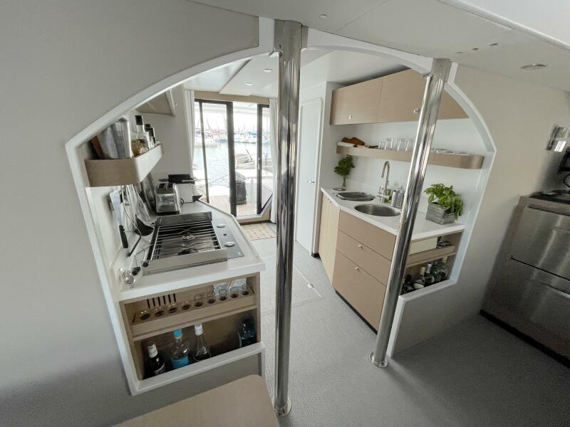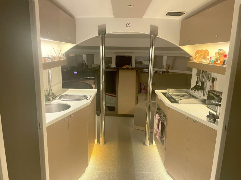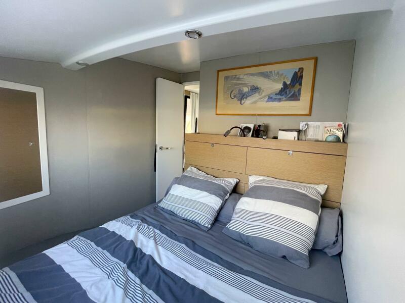 Below deck, her “Cockloon” layout connects the cockpit and saloon into a single, open-plan living area with excellent visibility. The central galley is secure and functional at sea, and generous storage throughout supports long-range self-sufficiency. The main-deck owner’s cabin and float cabins offer private, well-ventilated accommodation, carefully balanced for optimal sailing trim.