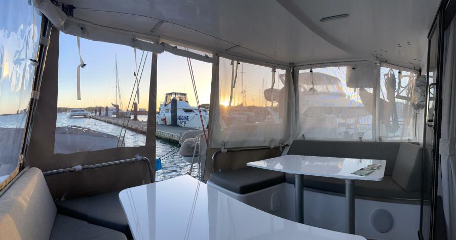 At the helm, Tahu’a offers superb responsiveness and control. The central hull delivers excellent upwind ability with precise feel, while the outer floats provide stability and power to carry ample sail area with confidence. Owners consistently report 200–220 nautical miles per day, with bursts of 15–18 knots in moderate breeze. She tracks well, accelerates quickly and maintains high averages without compromising safety or comfort.