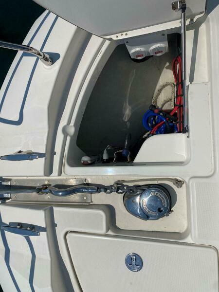 Forward of the helm area are four steps leading down into the companionway. Under the steps is the Splendid washer/dryer combo. There is a stateroom directly forward and the head is to starboard. On the left is the full beam master area with the master head on the right side. While facing aft, you take two steps down into the bedroom area with a loveseat on the starboard side and drawers for personal items under the bed and on the port side. There are two closets for personal items - one forward and one aft both on starboard side. This area has A/C control and LED lighting.