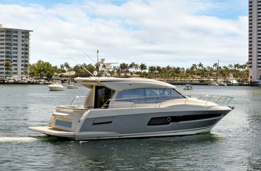 Boasting all the latest innovations of the brand, this sporty version integrates the concept that is so dear to Prestige. With her remarkable sporty look, the Prestige 460S benefits from an incomparable design, open to the exterior. Adaptable to suit your needs, the large opening sunroof and immense sliding glass door aft can be used to modulate the living space. The Prestige 460S allows one to enjoy an enhanced exterior space when fully opened and a more protected living space when closed. It is worth noting the enhanced modular design, featuring the L-shaped aft deck, which transforms into a very large sundeck.