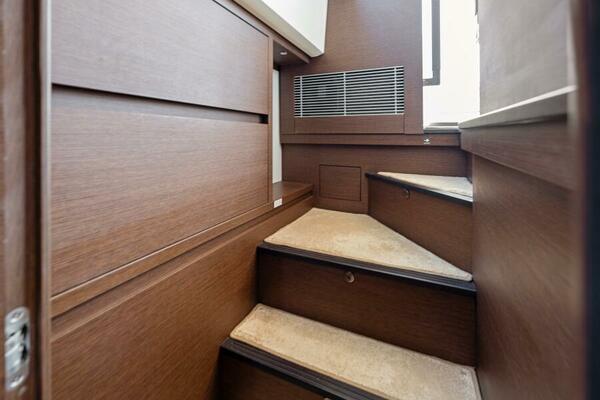 Access to the cockpit and a large L-shaped saloon with the lower helm to starboard and 3 staterooms below and two heads.The full beam master is aft with the exclusive private entry by the galley, which allows privacy and separation from the other staterooms.