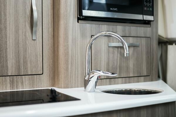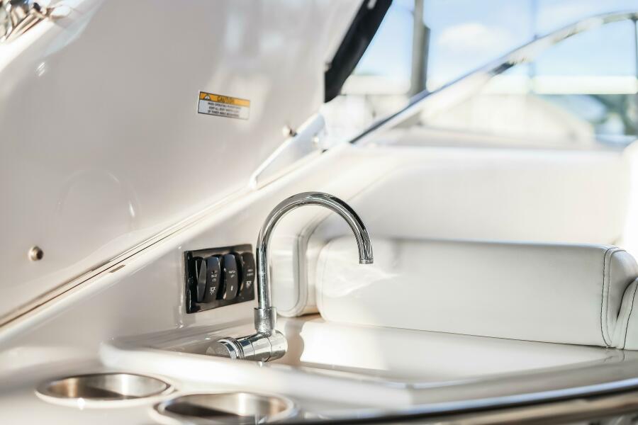 - Galley: Includes a microwave, electric cooktop, and a stainless-steel refrigerator, making it easy to prepare meals while on the water.