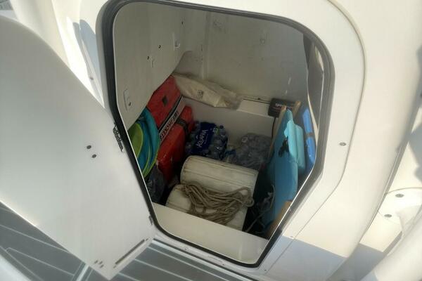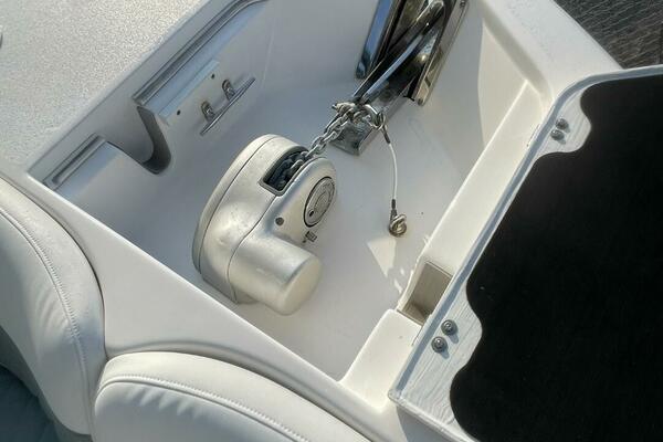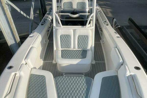 The Sea Fox 248 Commander has a forward seating arrangement with removable soft goods, table insert, and fold-away back rest. Equipped with a Maxwell Electric Windlass, grab railing, cup holders, in-deck storage locker, and center console forward seat. The center console is large in size with great storage capacity, hard top covered with more storage lockers, comfortable leaning post with fold-up seats, and Yeti Cooler. The stern has a livewell to port, 3/4 length seating with back rest combining storage locker, tow bar centered, Minn Kota power pole to port and swim ladder to starboard. Bolster cushions from stern to bow and ghost grey sea deck throughout.