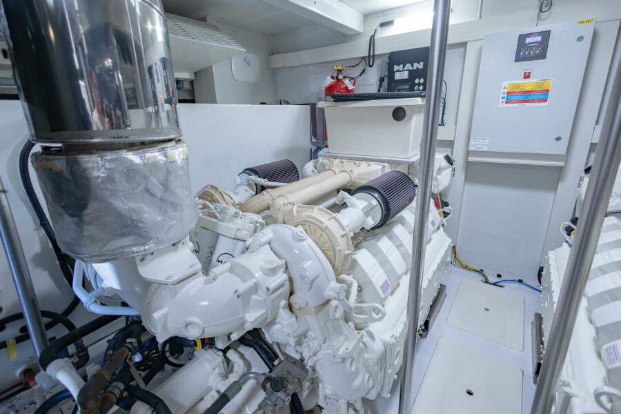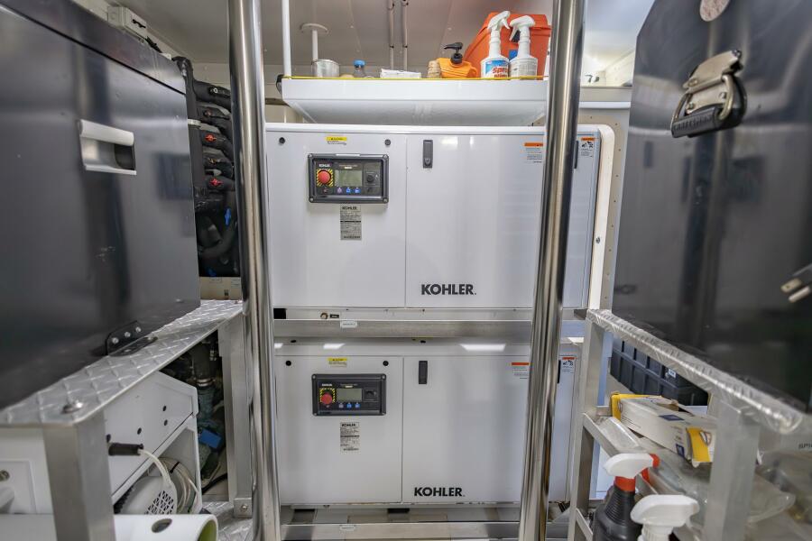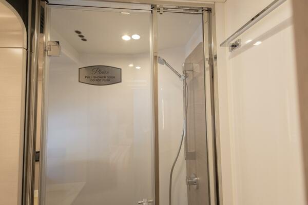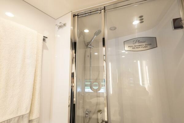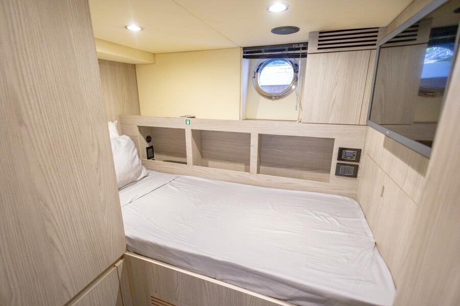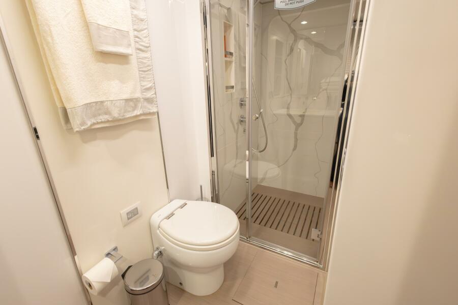 From the forward salon going down four steps brings you to the forward companionway. Moving forward is the VIP stateroom. Highlights include island queen berth, long side windows, abundant storage compartments, TV, and ensuite head with separate shower stall. To port is a second guest cabin with side-by-side single berths. This stateroom has access to the guest/day head. Additional items include a large hanging locker, porthole, reading lights, and TV. The third guest stateroom is to starboard. There are two single berths, abundant storage, TV, and reading lights. The full beam master stateroom is midship. She has a walk around queen berth. Forward of the berth is a TV behind a mirrored wall. There are two large hanging lockers with abundant storage. To starboard is a seating area with a table. The large side hull windows allow natural light to bathe the cabin in a warm glow. The overhead has recessed LED adjustable lighting and the sole has burbur carpet. The ensuite head is well lit with large mirrors and a large vanity, electric head, large shower stall and tile sole.