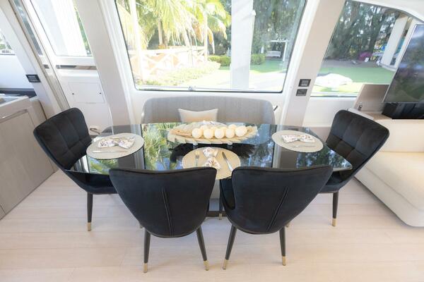 The salon is accessed through a massive stainless sliding door. To port is a large settee for six with a glass table. Across to starboard is a small love seat. Other highlights include a wine chiller, accent lighting, massive teardrop windows, and a wood grain sole. Midship to port is the galley with a full compliment of appliances, allowing the chef to prepare anything from a simple meal to a full course dining experience. Across to starboard is a dining table with seating for six.