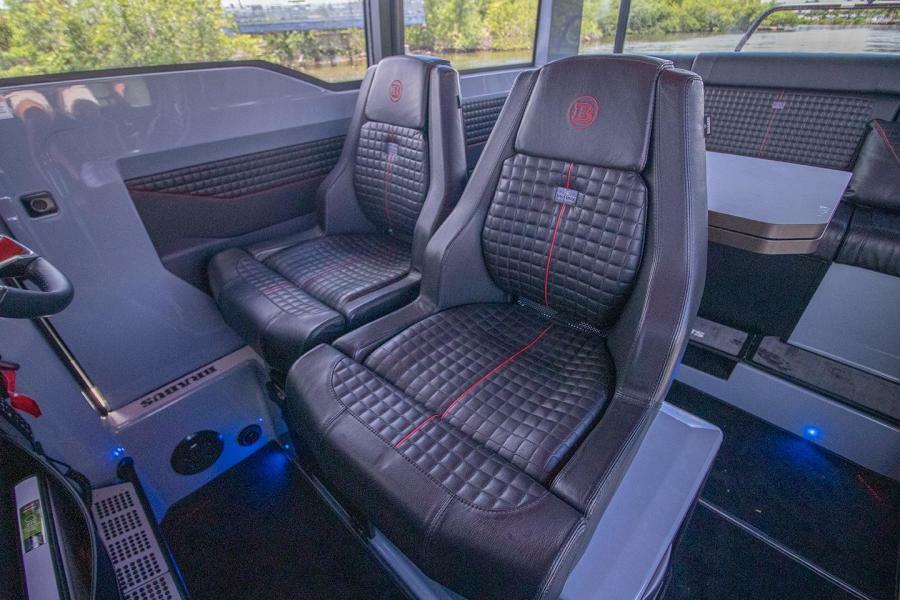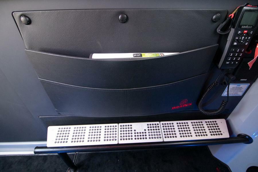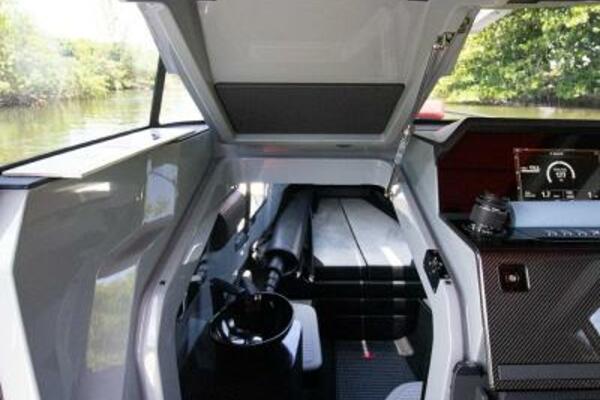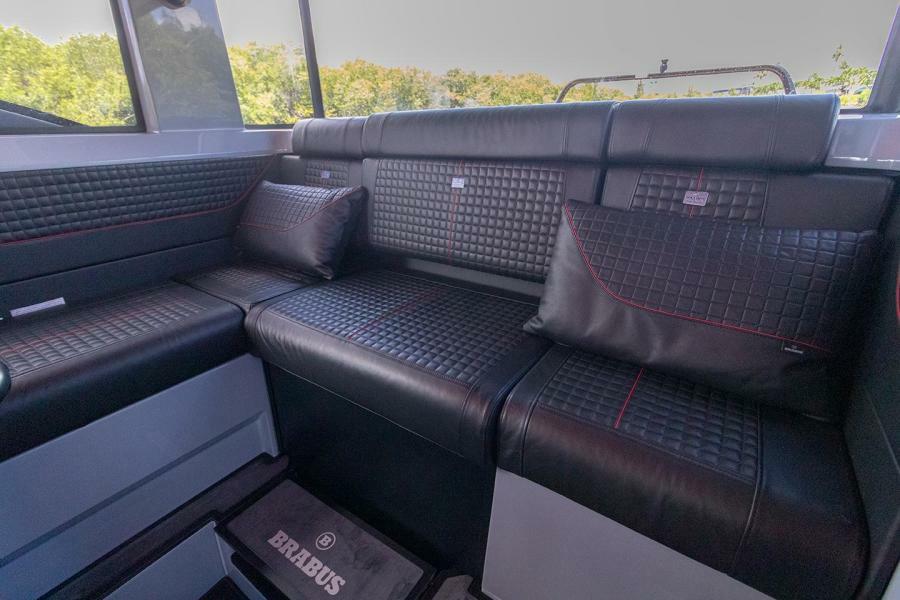 The helm features include a full Glass Bridge Information Display with two 12" screens with a BRABUS® User-Interface offering a selection of driver-orientated sport modes. The Intelligent Steering Module with integrated trim tab, bow thruster and audio controls will enable you to control the boat even smoother than ever before. A Extended glass bridge information display with two additional 9" screens, WIFI on board connectivity, and 3G/USB mobile router.