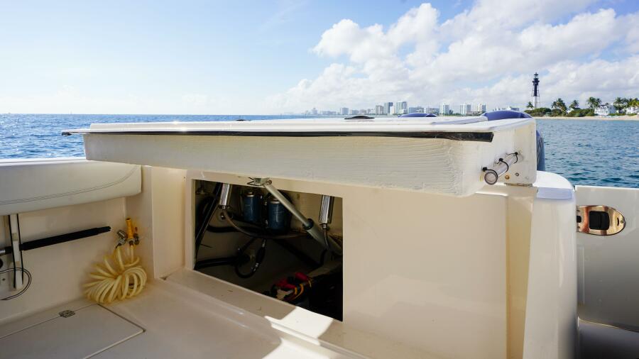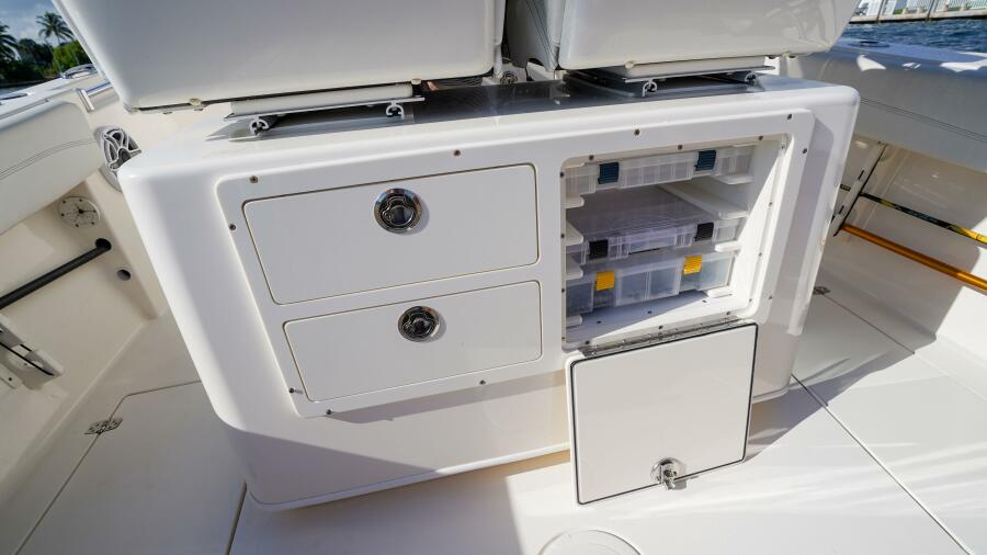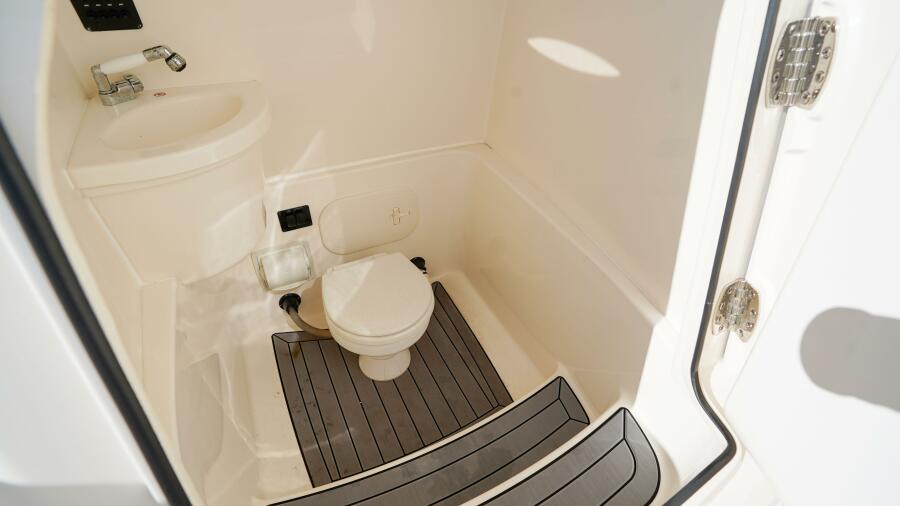 Access to the console interior is through a wide, side-hinged door at the helm. Inside, the surprisingly spacious compartment includes a marine head, freshwater sink, and additional storage. The headroom is ample, and the finish is clean and easy to maintain—excellent for family comfort during long outings.