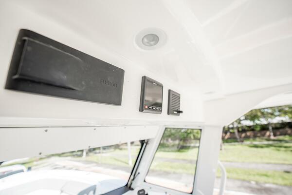 - Fiberglass hardtop with aluminum powder-coated frame includes LED lights, spreader lights, electric sliding windshield, electronics box, (5) rod holders, a set of kingfish rod holders