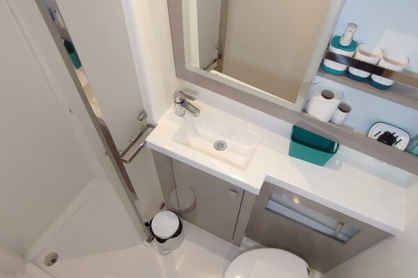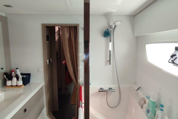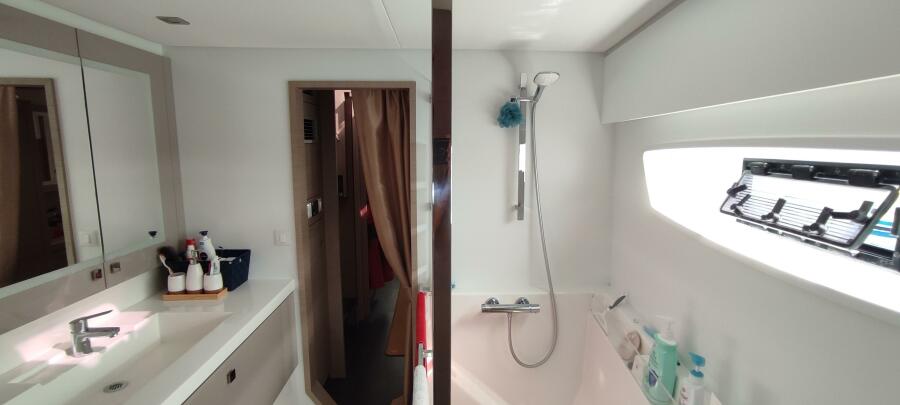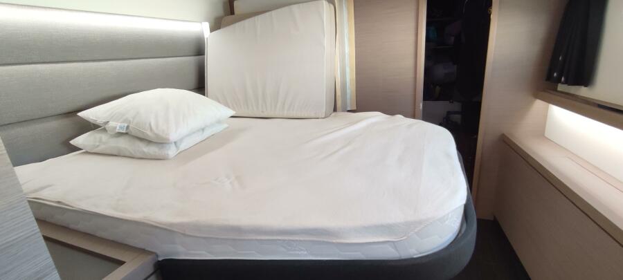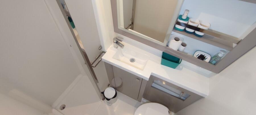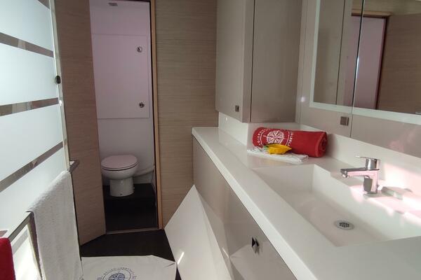 Inside, the Maestro three-cabin layout showcases Fountaine Pajot’s hallmark of light, space and liveability. The bright saloon flows seamlessly into the galley and cockpit, creating a welcoming social area ideal for entertaining or extended cruising. The starboard hull is dedicated to the owner’s suite, featuring a queen-sized berth, ample storage, vanity space and a private ensuite with a separate shower. Two spacious guest cabins with ensuites occupy the port hull, complemented by an additional crew cabin forward.