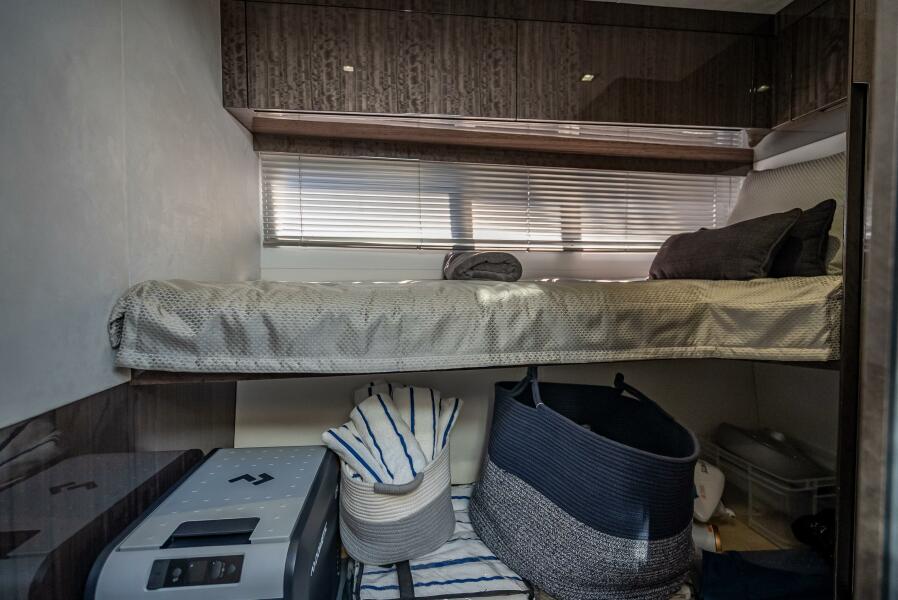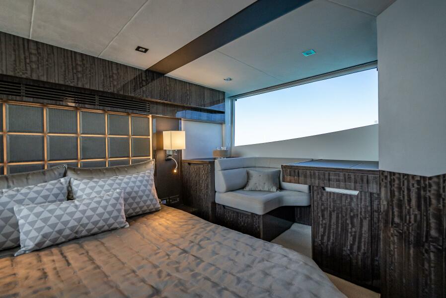 Down below, three cabins and two bathrooms await the passengers for a total of six berths. The master cabin, located midship, offers a double bed, large wardrobe and a private bathroom. Offer your guests the bow VIP cabin for spectacular night views thanks to a series of skylights. All quarters offer standing height and have access to natural light. The sumptuous master stateroom is the ideal space for privacy at the end of a day full of socializing and adventure.