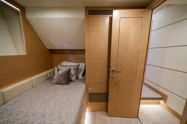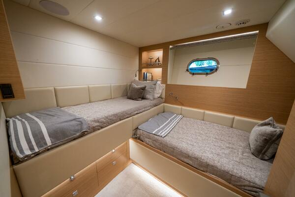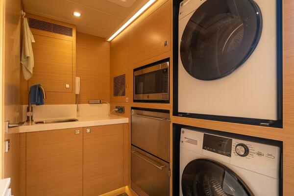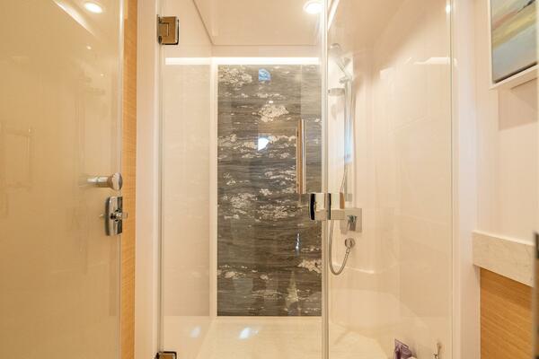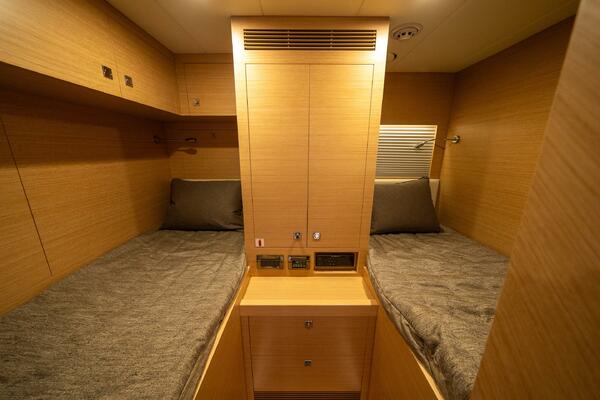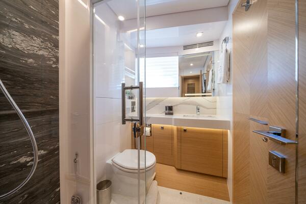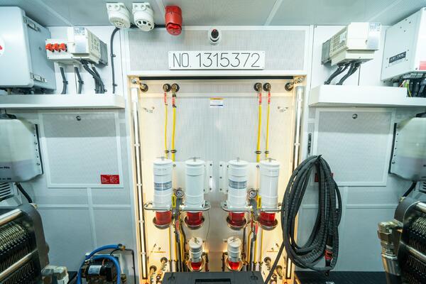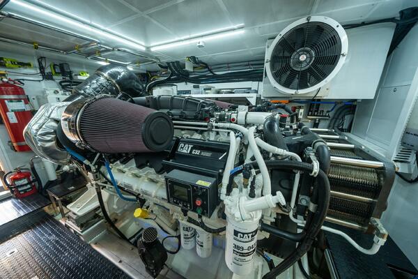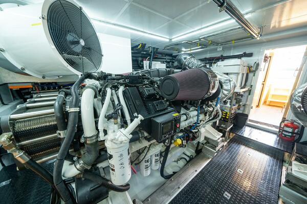 The immaculate engine room, accessible through a watertight door, is well-organized for easy maintenance. The 1,000-hour service was completed in March 2024, and extended engine warranties are transferable. The yacht will be sold with full maintenance records and all machinery services up to date. The knowledgeable captain can assist with a seamless handover.