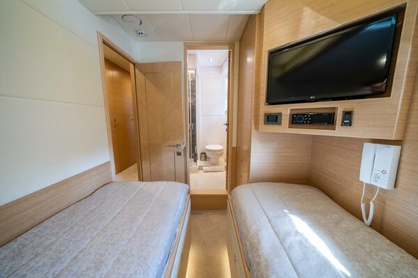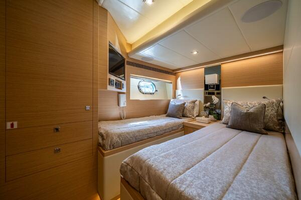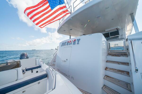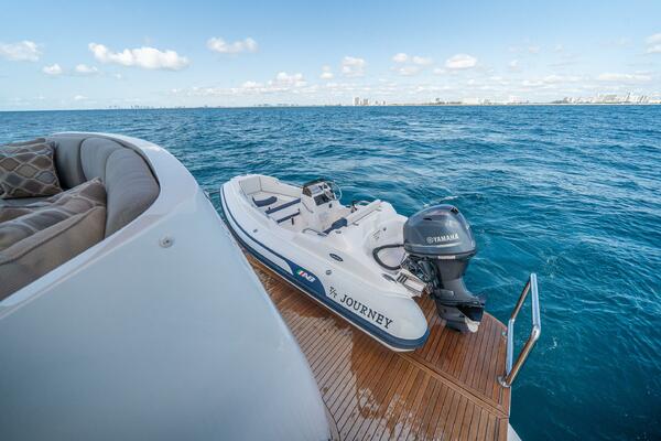 JOURNEY sleeps 8 guests in 4 cabins including a spacious full beam master and equally impressive VIP + 2 crew in separate accommodations back aft complete with crew mess, and small crew galley. A hydraulic swim platform currently holds an AB tender (included in the deal) and the upper aft deck has an additional davit providing new the ability to carry a second tender or 2 full size jet skis and/or to create a beautiful bespoke lounge area for sun.