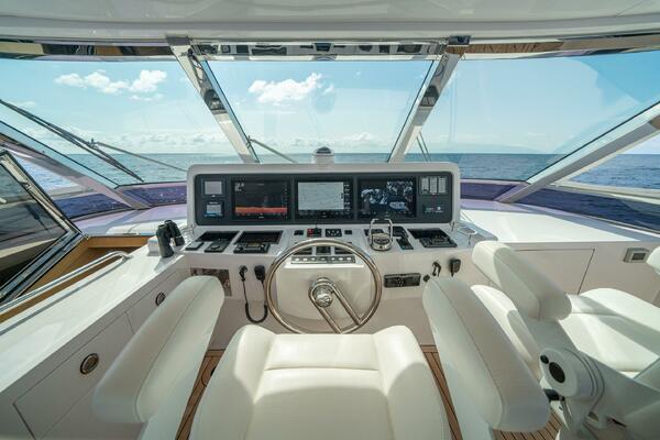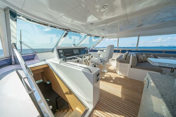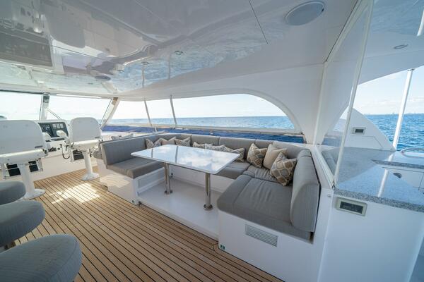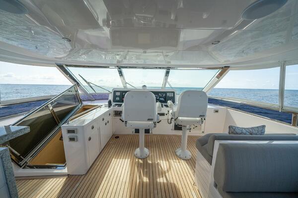 The CLIMATE CONTROLLED upper helm features two captain's chairs and a fixed glass windshield. The area can be fully enclosed and features removable partitions, and a hatch that leads to the main salon/galley area. The layout reflects thoughtful design and the owner's experience.