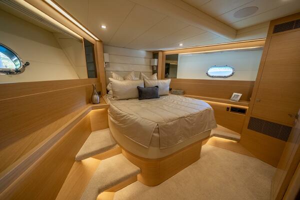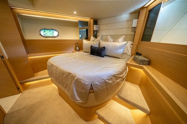 •Custom change to master layout to show the head 3/4 and the starboard corner closet behind the bed, while the hull/house deck/flybridge deck is extended 2'