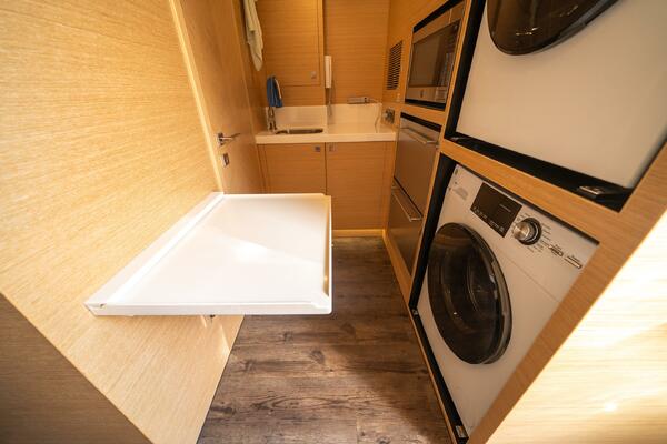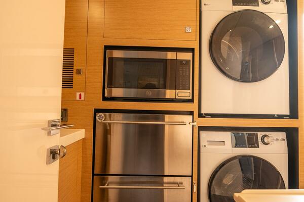 At the front, a U-shaped settee is perfect for meals or work, with doors to the exterior and bow on both sides. Stairs to port lead down to the guest area, which includes a full beam master cabin with ensuite dual sinks, two guest cabins sharing a full bathroom, and a forward VIP cabin with ensuite. A full-size washer and dryer are in the guest area, with another set in the crew area aft.
