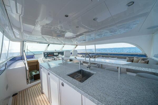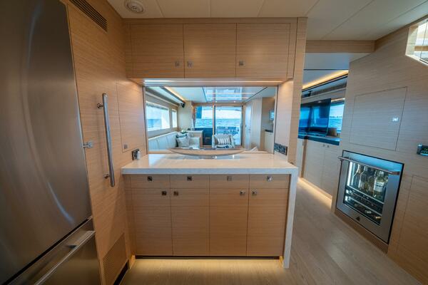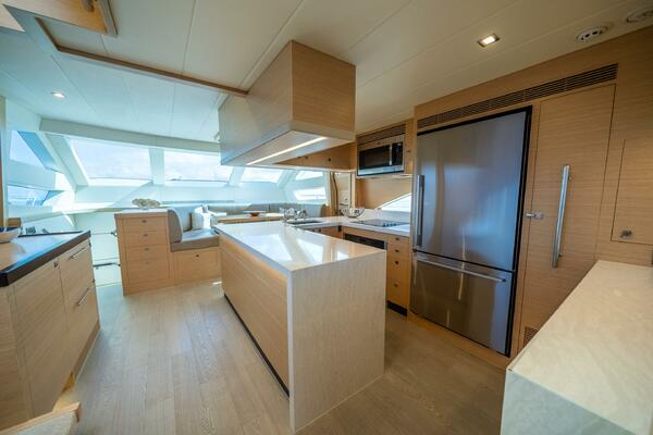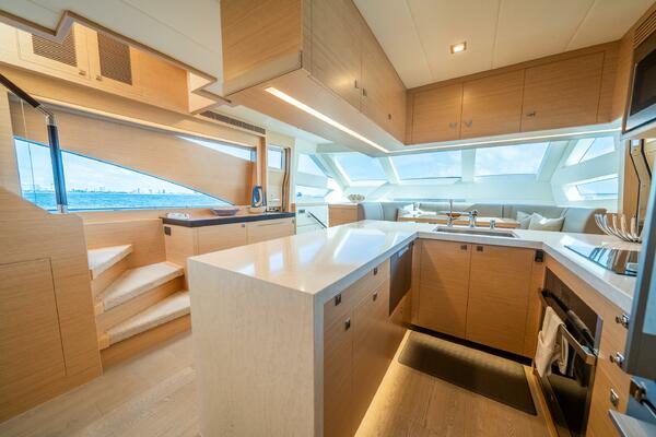 The aft salon features a large L-shaped settee across from a pop-up TV and convenient day head near the sliding door. Moving forward, the galley offers ample counter space, upper storage with accent lighting, and a partition for separation for finer dining on special occasions. Furthermore, this vessel also includes a beautiful wine cooler and small pantry under the stairs to the sundeck for additional storage.