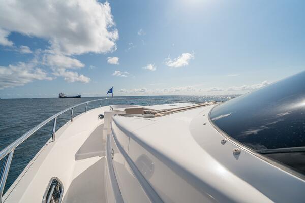 •Permanent forward facing glass windshield on the flybridge (in front of the helm station)