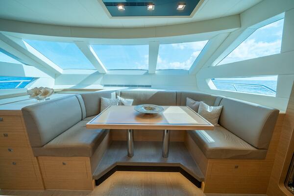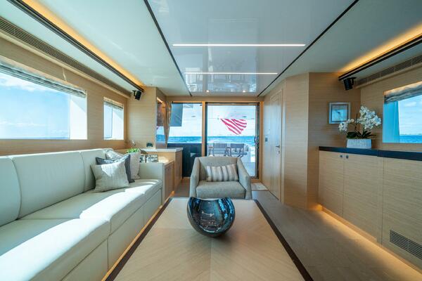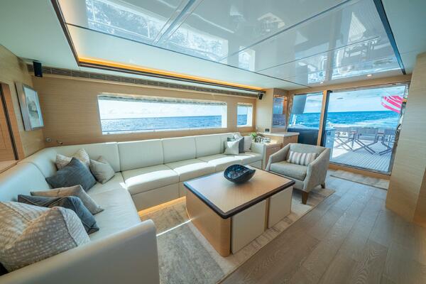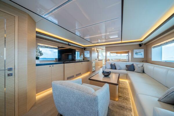 As you step into the salon, you're greeted by soft woods, natural earth tones, and great lighting, creating an inviting atmosphere. The open layout allows a clear view to the bow through forward-facing windows.