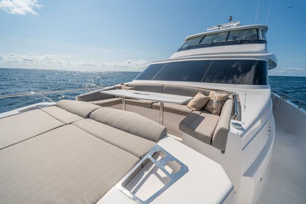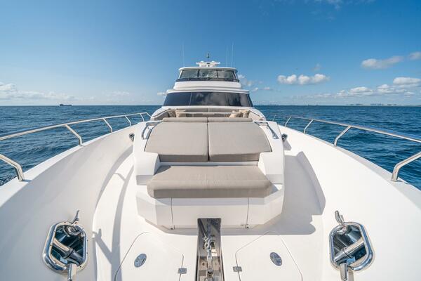 The bow area offers a lounge with built-in seating and lounge pads, perfect for relaxation.
